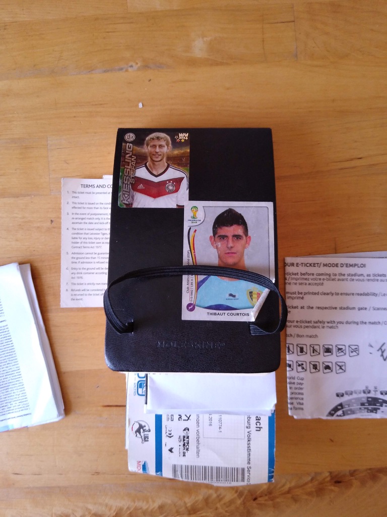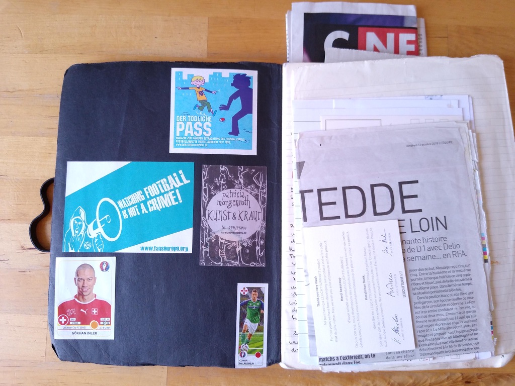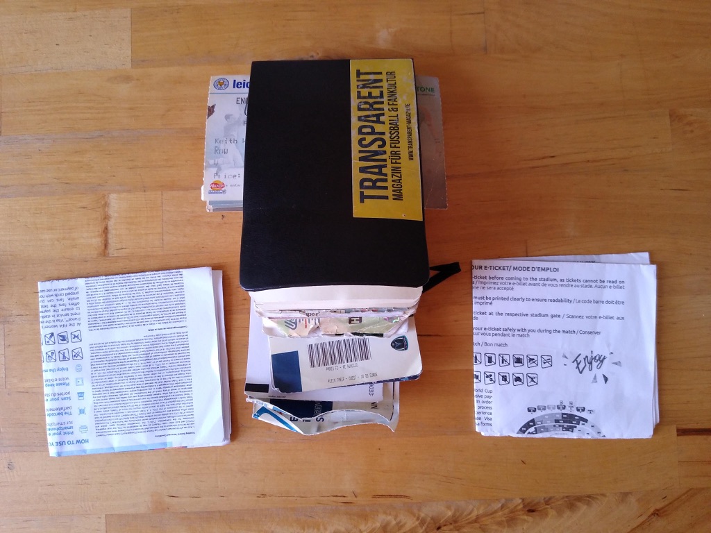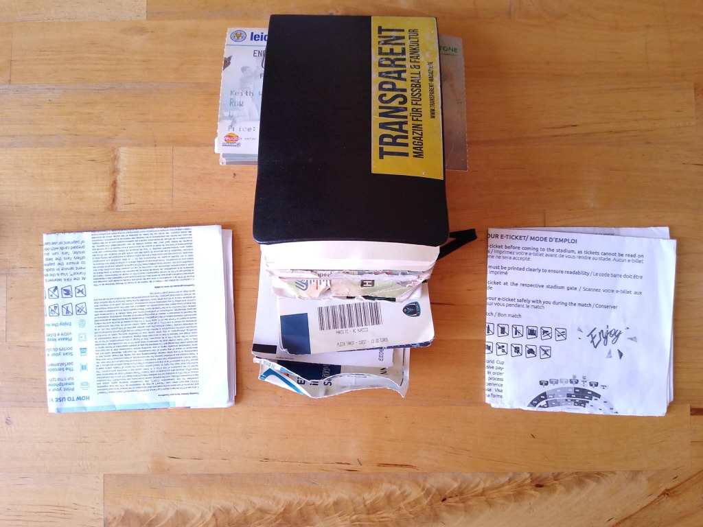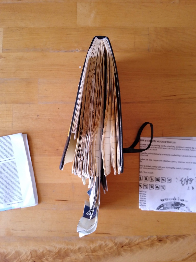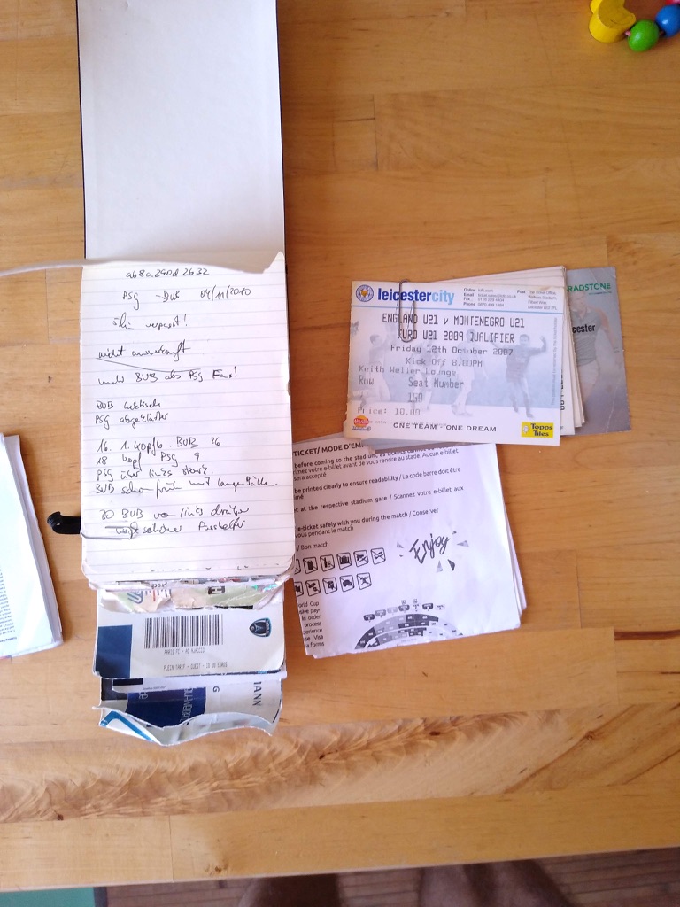 The second image portrays my sketch book, also from Moleskine. This I have used exclusively to make notes during football matches. It began with PSG’s match against Stade Rennes in September 2010 and almost nine years later, in September 2019 I closed it after Red Star’s meeting with Dunkirk. In between there are matches from Austria and Germany, but mainly in France. For instance Dortmund’s invasion of Paris and the Parc des Princes in autumn 2010 for a Europa League match. Invasion because inside the ground were just as many BVB supporters as there were PSG fans. And the away fans were much louder. There are match reports from the World Cup in France this summer, which is the biggest tournament I have visited. Interestingly, for most matches the tickets are attached to the pages of the sketch book, which provides an interesting collection and material for another text.